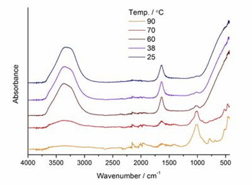 Pengukuran dilakukan pada rentang suhu 25 hingga 90 °C menggunakan fitur heated top-plate pada Golden Gate ATR. Pendekatan ini memungkinkan pengamatan perubahan spektrum seiring dengan meningkatnya suhu sampel.